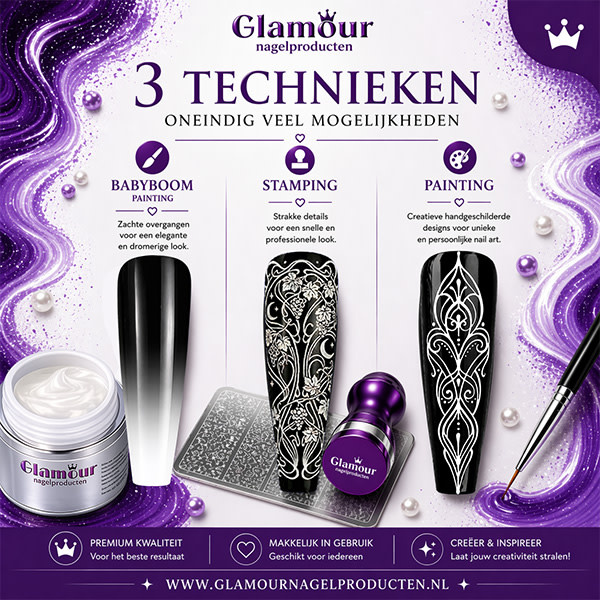 The stamping gel is a 3-in-1 gel and can be used for stamping, drawing and babyboom. Stamp on the gel with a stamping plate, draw your own art with a nailart brush or sponge on the babyboom.