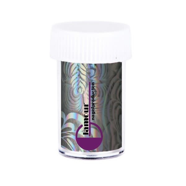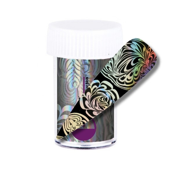 With holographic transfer foil you can easily apply fun patterns to your nails. Apply the transfer foil glue to the last color layer and press the foil to the nail.