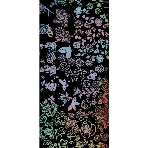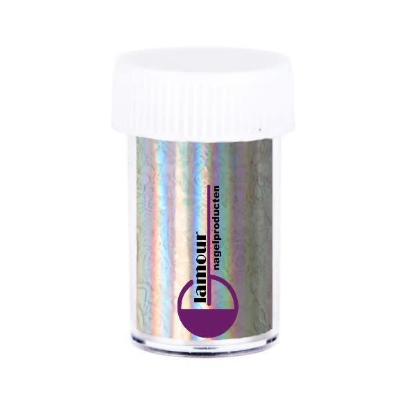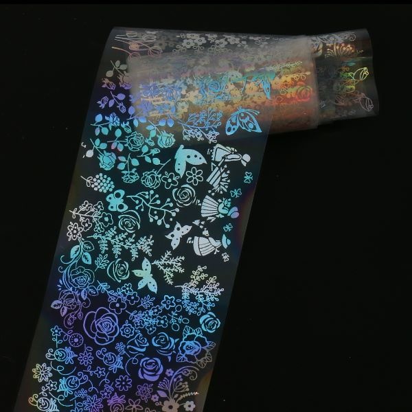 With holographic transfer foil you can easily apply fun patterns to your nails. Apply the transfer foil glue to the last color layer and press the foil to the nail.