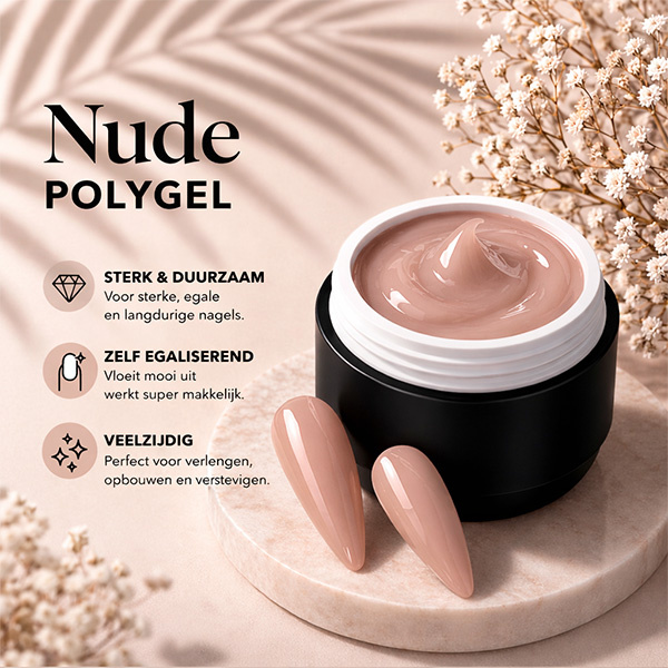 Antes de que puedas comenzar a aplicar el Polygel, tienes que preparar las uñas. Puedes preparar las uñas con Nail Prep y Primer o Ultra Bond. Después de esto se puede aplicar la basegel. Solo necesitas una capa delgada de la basegel. Después de curar esta capa puedes empezar a construir.Recoge una pequeña cantidad en tu espátula y aplica esto en la uña. Sumerge el pincel en Slip Solution y comienza a modelar el polygel. Deje curar durante 2 minutos en una lámpara UV o 60 segundos en una lámpara LED.